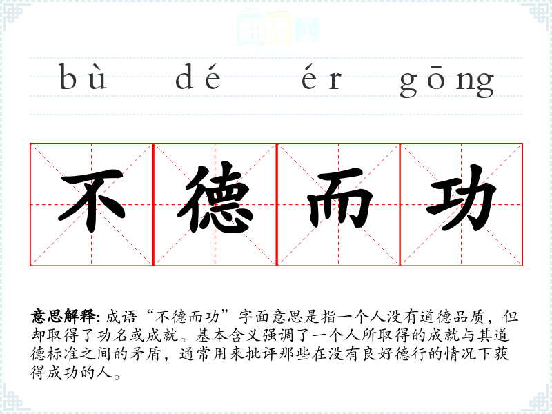 成语“不德而功”字面意思是指一个人没有道德品质,但却取得了功名或成就。基本含义强调了一个人所取得的成就与其道德标准之间的矛盾,通常用来批评那些在没有良好德行的情况下获得成功的人。