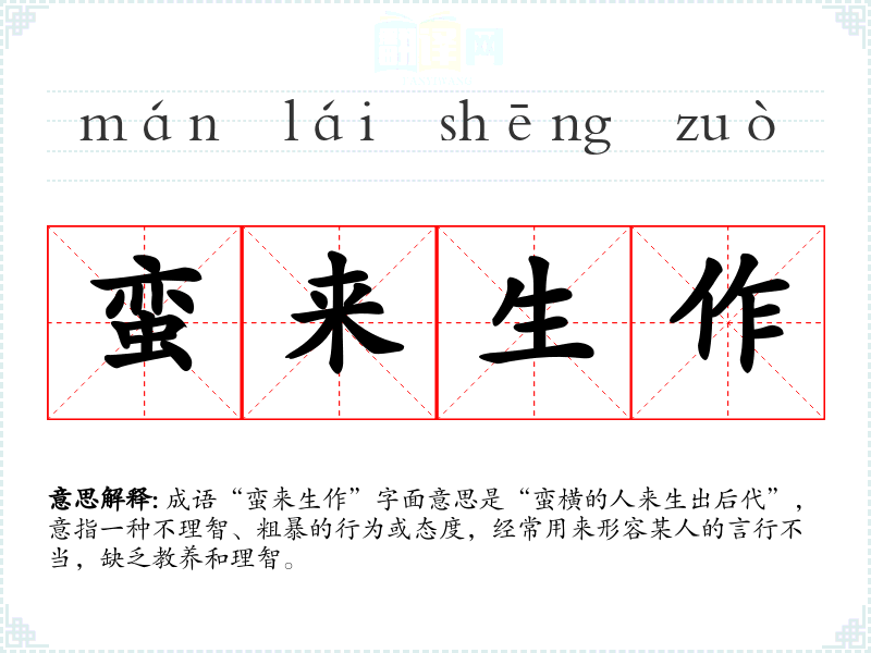 成语“蛮来生作”字面意思是“蛮横的人来生出后代”,意指一种不理智、粗暴的行为或态度,经常用来形容某人的言行不当,缺乏教养和理智。