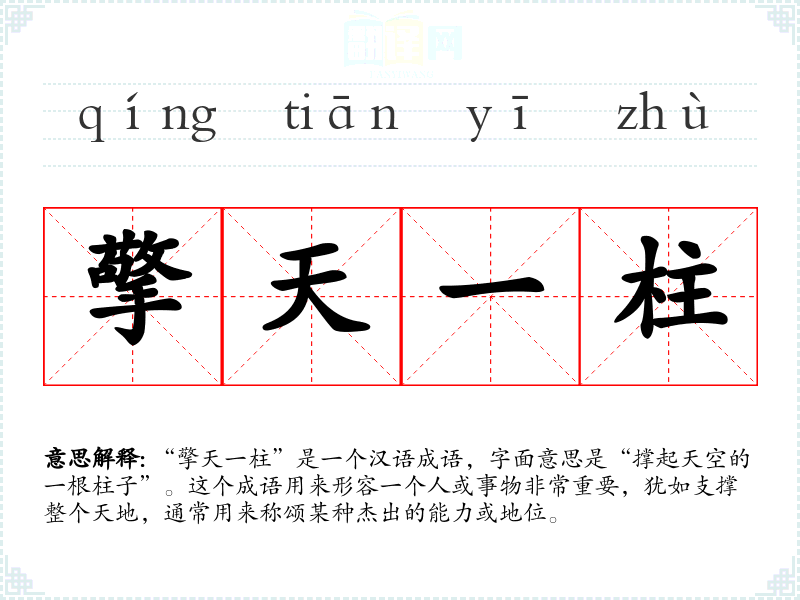 “擎天一柱”是一个汉语成语,字面意思是“撑起天空的一根柱子”。这个成语用来形容一个人或事物非常重要,犹如支撑整个天地,通常用来称颂某种杰出的能力或地位。