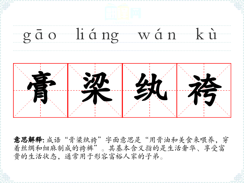 成语“膏梁纨袴”字面意思是“用膏油和美食来喂养,穿着丝绸和细麻制成的袴裤”。其基本含义指的是生活奢华、享受富贵的生活状态,通常用于形容富裕人家的子弟。