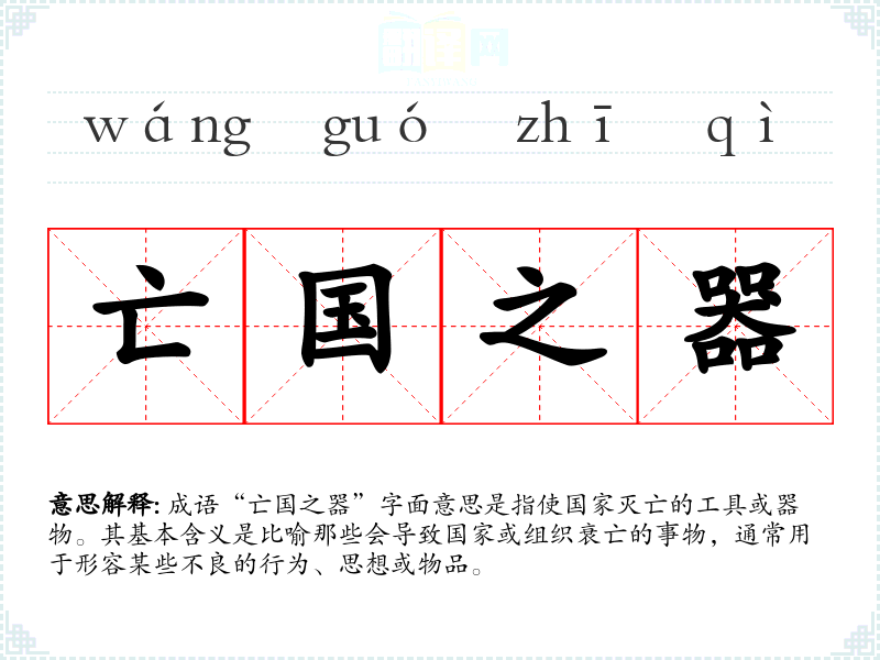 成语“亡国之器”字面意思是指使国家灭亡的工具或器物。其基本含义是比喻那些会导致国家或组织衰亡的事物,通常用于形容某些不良的行为、思想或物品。