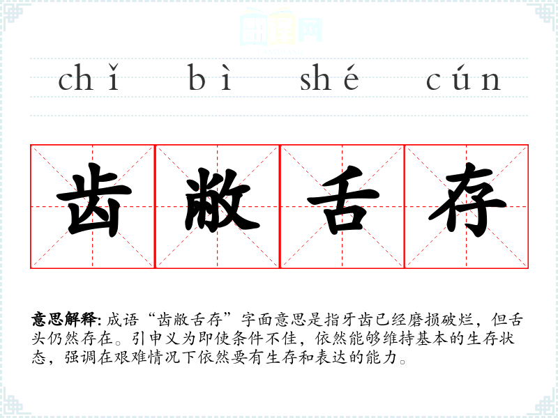 成语“齿敝舌存”字面意思是指牙齿已经磨损破烂,但舌头仍然存在。引申义为即使条件不佳,依然能够维持基本的生存状态,强调在艰难情况下依然要有生存和表达的能力。