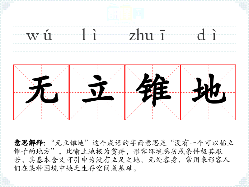 “无立锥地”这个成语的字面意思是“没有一个可以插立锥子的地方”,比喻土地极为贫瘠,形容环境恶劣或条件极其艰苦。其基本含义可引申为没有立足之地、无处容身,常用来形容人们在某种困境中缺乏生存空间或基础。