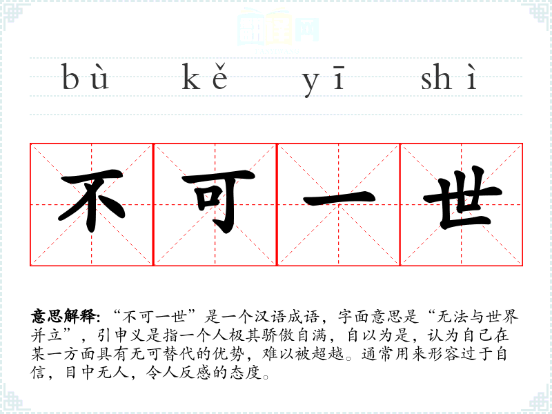 “不可一世”是一个汉语成语,字面意思是“无法与世界并立”,引申义是指一个人极其骄傲自满,自以为是,认为自己在某一方面具有无可替代的优势,难以被超越。通常用来形容过于自信,目中无人,令人反感的态度。