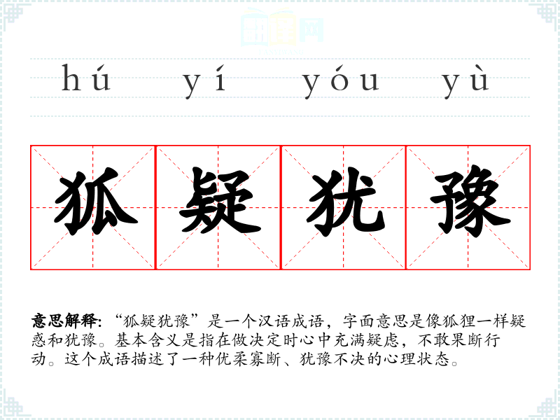“狐疑犹豫”中的“狐疑”意为怀疑、疑惑,而“犹豫”则是犹豫不决。成语的具体来源没有明确的历史文献,但在古典文学中,狐狸常常被描绘为狡猾和多疑的动物,因此这个成语可能与古人对于狐狸性格的观察有关。
