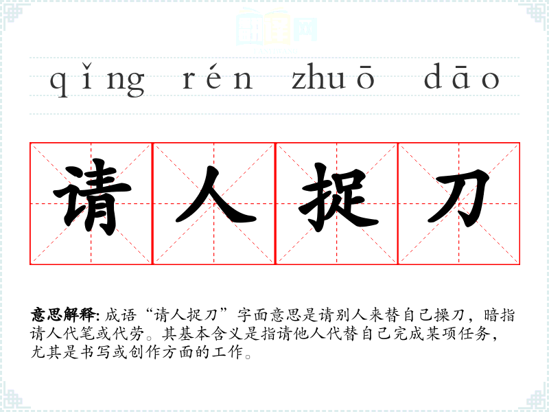 成语“请人捉刀”字面意思是请别人来替自己操刀,暗指请人代笔或代劳。其基本含义是指请他人代替自己完成某项任务,尤其是书写或创作方面的工作。