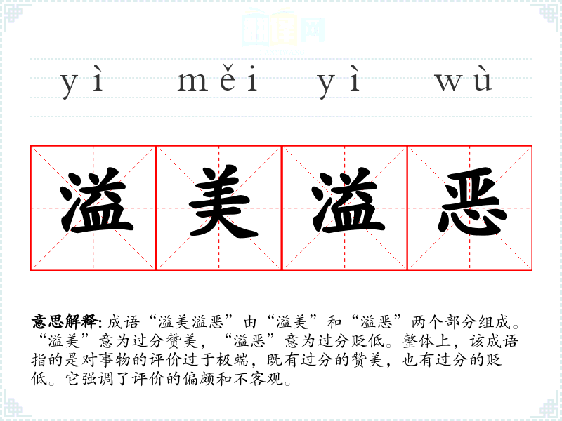 成语“溢美溢恶”由“溢美”和“溢恶”两个部分组成。“溢美”意为过分赞美,“溢恶”意为过分贬低。整体上,该成语指的是对事物的评价过于极端,既有过分的赞美,也有过分的贬低。它强调了评价的偏颇和不客观。