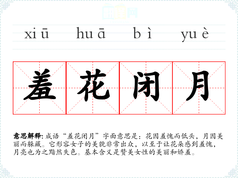 - 闭月羞花:与“羞花闭月”意思相近,强调女子的美丽使花和月都感到羞愧。