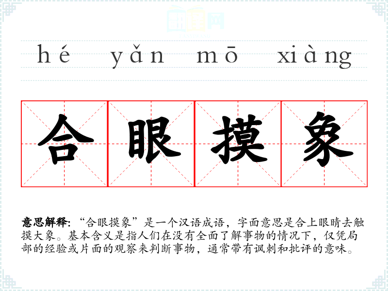 “合眼摸象”是一个汉语成语,字面意思是合上眼睛去触摸大象。基本含义是指人们在没有全面了解事物的情况下,仅凭局部的经验或片面的观察来判断事物,通常带有讽刺和批评的意味。