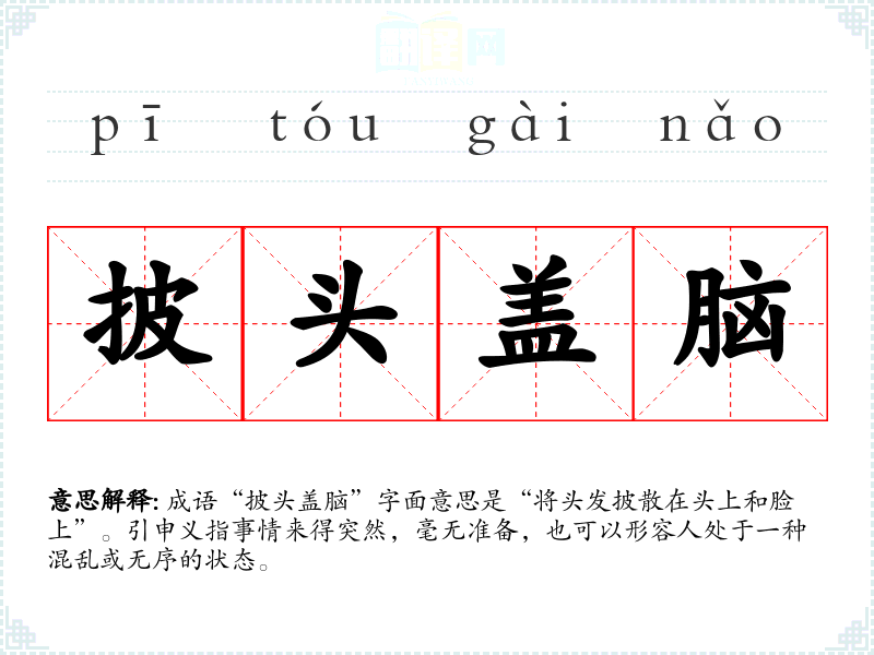 成语“披头盖脑”字面意思是“将头发披散在头上和脸上”。引申义指事情来得突然,毫无准备,也可以形容人处于一种混乱或无序的状态。