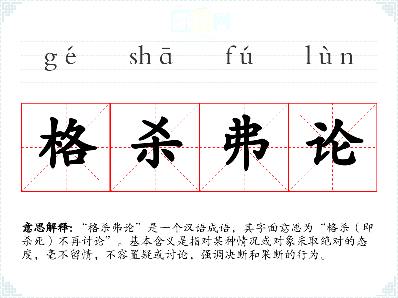 “格杀弗论”是一个汉语成语,其字面意思为“格杀(即杀死)不再讨论”。基本含义是指对某种情况或对象采取绝对的态度,毫不留情,不容置疑或讨论,强调决断和果断的行为。