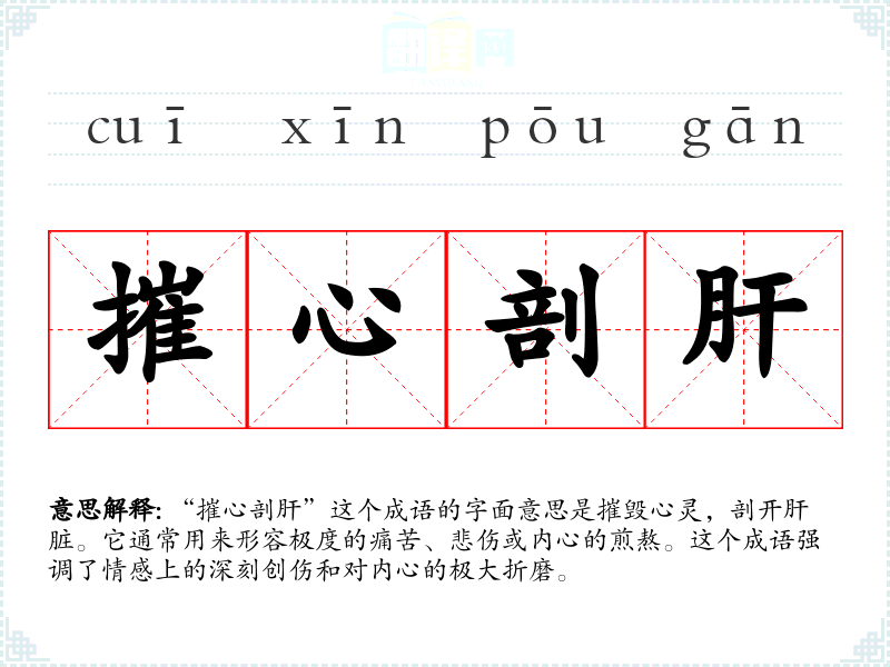 “摧心剖肝”这个成语的字面意思是摧毁心灵,剖开肝脏。它通常用来形容极度的痛苦、悲伤或内心的煎熬。这个成语强调了情感上的深刻创伤和对内心的极大折磨。