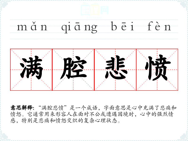 “满腔悲愤”是一个成语,字面意思是心中充满了悲痛和愤怒。它通常用来形容人在面对不公或遭遇困境时,心中的强烈情感,特别是悲痛和愤怒交织的复杂心理状态。