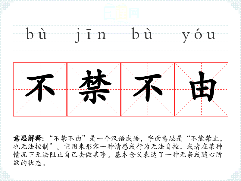 “不禁不由”是一个汉语成语,字面意思是“不能禁止,也无法控制”。它用来形容一种情感或行为无法自控,或者在某种情况下无法阻止自己去做某事。基本含义表达了一种无奈或随心所欲的状态。
