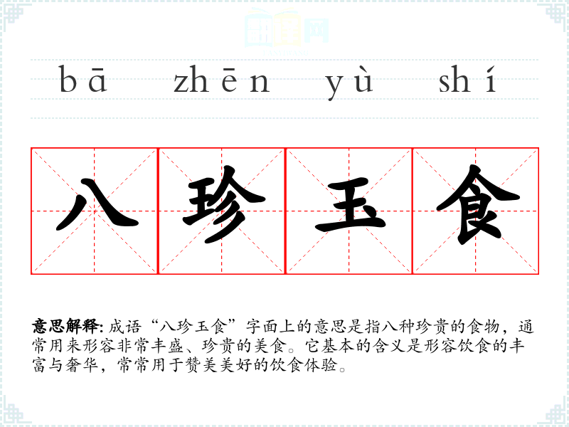 成语“八珍玉食”字面上的意思是指八种珍贵的食物,通常用来形容非常丰盛、珍贵的美食。它基本的含义是形容饮食的丰富与奢华,常常用于赞美美好的饮食体验。