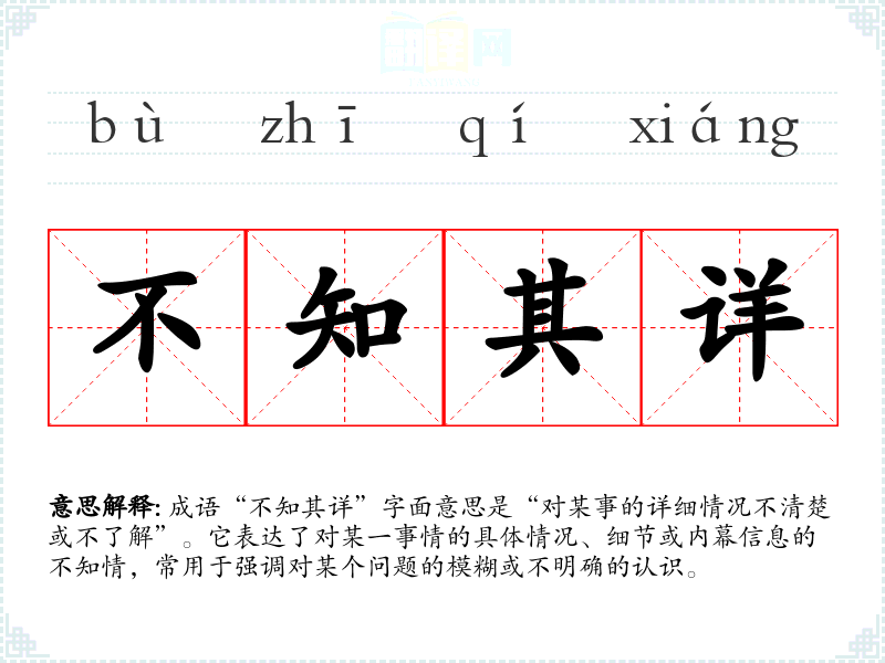 成语“不知其详”字面意思是“对某事的详细情况不清楚或不了解”。它表达了对某一事情的具体情况、细节或内幕信息的不知情,常用于强调对某个问题的模糊或不明确的认识。