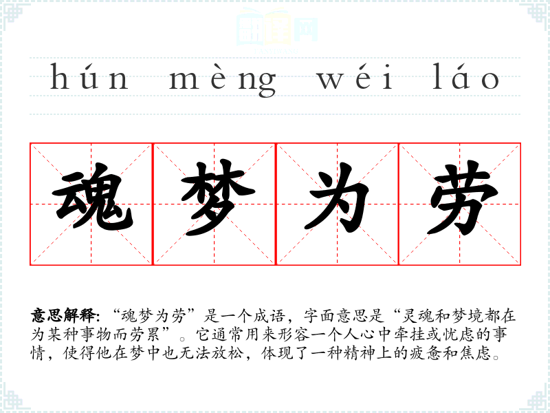 “魂梦为劳”是一个成语,字面意思是“灵魂和梦境都在为某种事物而劳累”。它通常用来形容一个人心中牵挂或忧虑的事情,使得他在梦中也无法放松,体现了一种精神上的疲惫和焦虑。