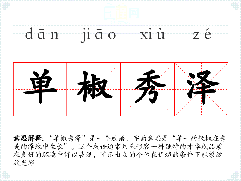 “单椒秀泽”是一个成语,字面意思是“单一的辣椒在秀美的泽地中生长”。这个成语通常用来形容一种独特的才华或品质在良好的环境中得以展现,暗示出众的个体在优越的条件下能够绽放光彩。