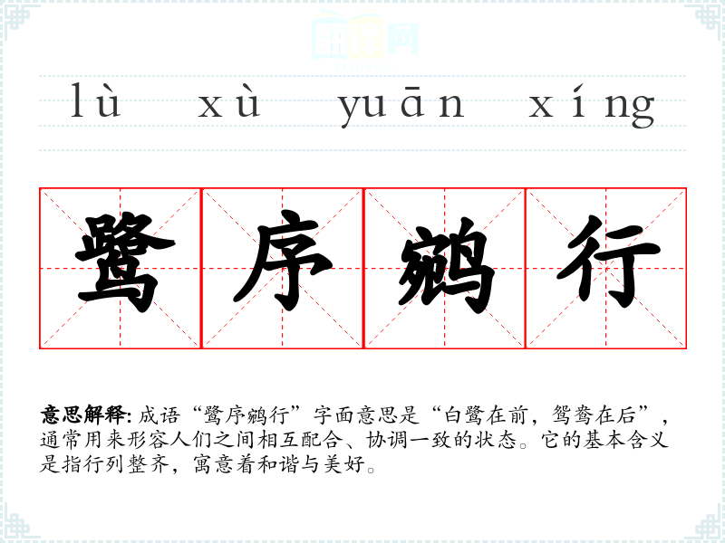 成语“鹭序鹓行”字面意思是“白鹭在前,鸳鸯在后”,通常用来形容人们之间相互配合、协调一致的状态。它的基本含义是指行列整齐,寓意着和谐与美好。