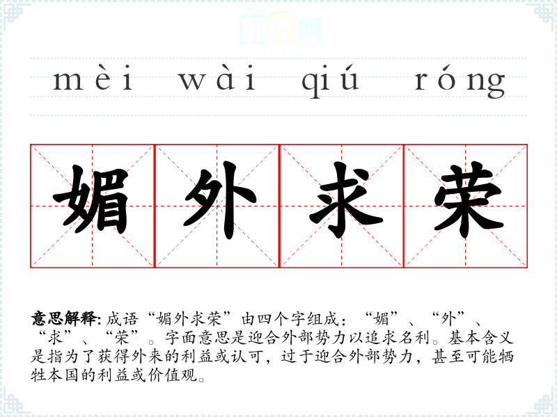 成语“媚外求荣”由四个字组成:“媚”、“外”、“求”、“荣”。字面意思是迎合外部势力以追求名利。基本含义是指为了获得外来的利益或认可,过于迎合外部势力,甚至可能牺牲本国的利益或价值观。
