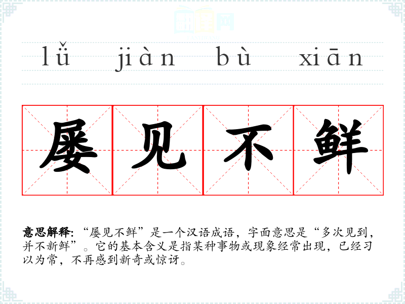 | 屡见不鲜 | 屡:多次;鲜:新鲜,新奇。常常见到,并不新奇。 |
