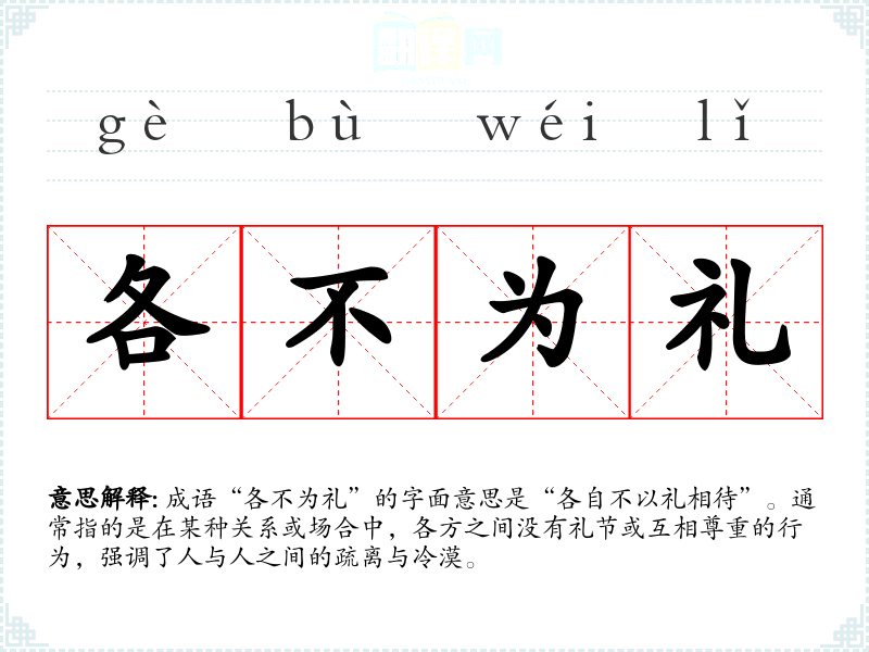 成语“各不为礼”的字面意思是“各自不以礼相待”。通常指的是在某种关系或场合中,各方之间没有礼节或互相尊重的行为,强调了人与人之间的疏离与冷漠。