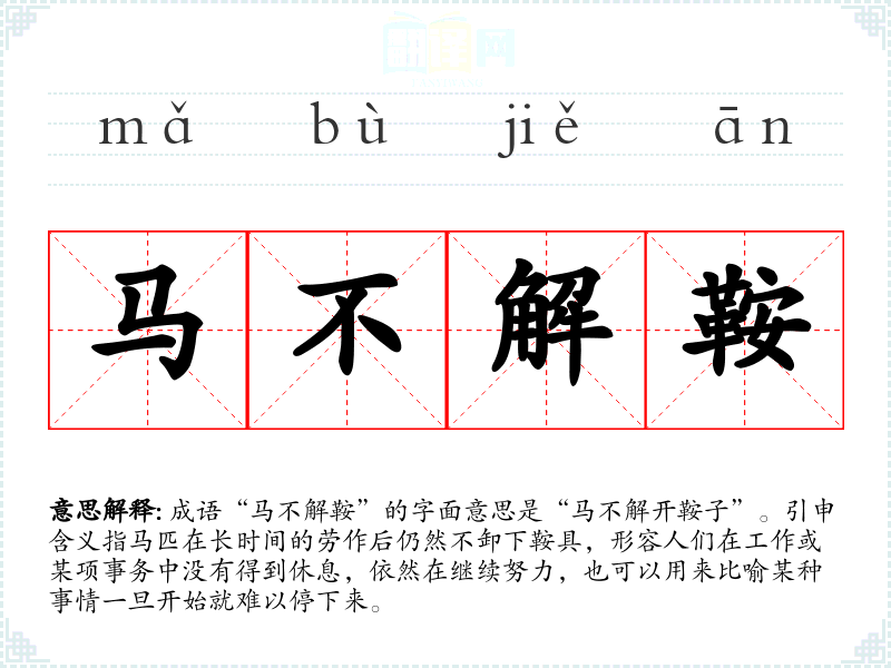 成语“马不解鞍”的字面意思是“马不解开鞍子”。引申含义指马匹在长时间的劳作后仍然不卸下鞍具,形容人们在工作或某项事务中没有得到休息,依然在继续努力,也可以用来比喻某种事情一旦开始就难以停下来。