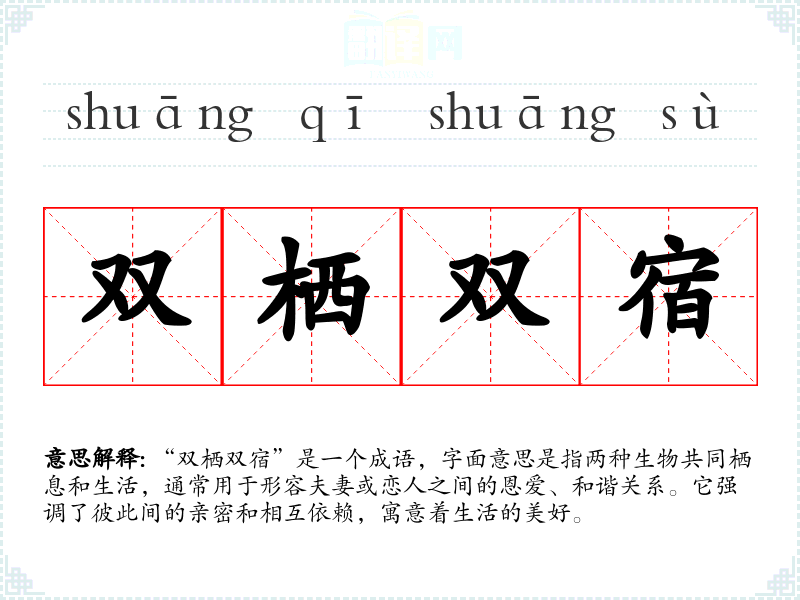 “双栖双宿”是一个成语,字面意思是指两种生物共同栖息和生活,通常用于形容夫妻或恋人之间的恩爱、和谐关系。它强调了彼此间的亲密和相互依赖,寓意着生活的美好。