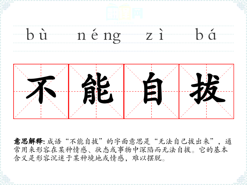 成语“不能自拔”的字面意思是“无法自己拔出来”,通常用来形容在某种情感、状态或事物中深陷而无法自拔。它的基本含义是形容沉迷于某种境地或情感,难以摆脱。