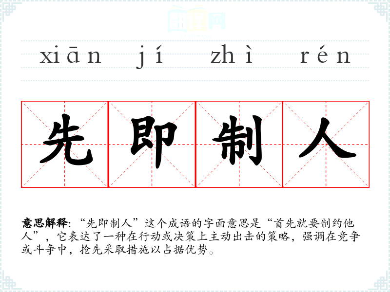 “先即制人”这个成语的字面意思是“首先就要制约他人”,它表达了一种在行动或决策上主动出击的策略,强调在竞争或斗争中,抢先采取措施以占据优势。