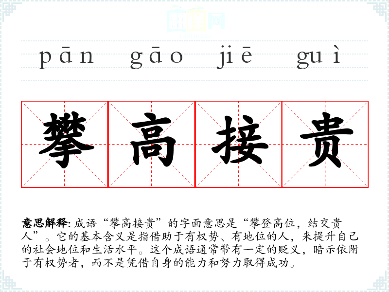 成语“攀高接贵”的字面意思是“攀登高位,结交贵人”。它的基本含义是指借助于有权势、有地位的人,来提升自己的社会地位和生活水平。这个成语通常带有一定的贬义,暗示依附于有权势者,而不是凭借自身的能力和努力取得成功。
