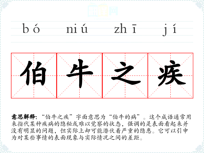 “伯牛之疾”字面意思为“伯牛的病”。这个成语通常用来指代某种疾病的隐秘或难以觉察的状态,强调的是表面看起来并没有明显的问题,但实际上却可能潜伏着严重的隐患。它可以引申为对某些事情的表面现象与实际情况之间的差距。