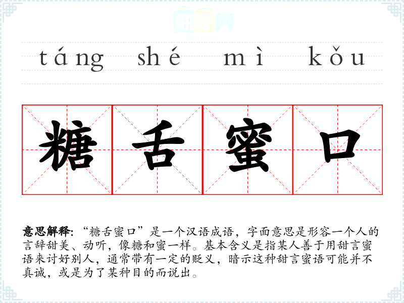 | 糖舌蜜口 | 甜言蜜语,说讨人喜欢的动听的话。 |
