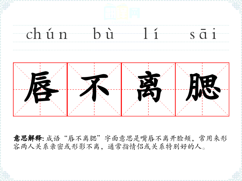 成语“唇不离腮”字面意思是嘴唇不离开脸颊,常用来形容两人关系亲密或形影不离,通常指情侣或关系特别好的人。