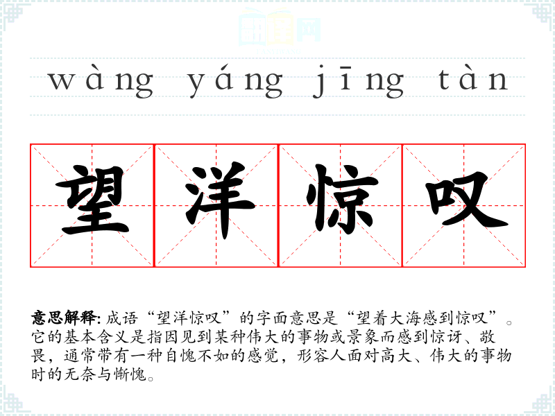 成语“望洋惊叹”的字面意思是“望着大海感到惊叹”。它的基本含义是指因见到某种伟大的事物或景象而感到惊讶、敬畏,通常带有一种自愧不如的感觉,形容人面对高大、伟大的事物时的无奈与惭愧。