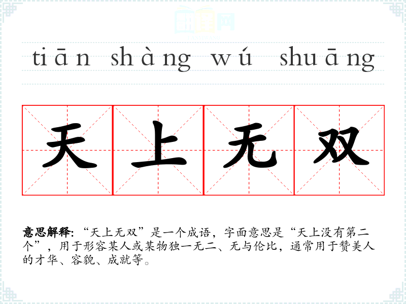 “天上无双”是一个成语,字面意思是“天上没有第二个”,用于形容某人或某物独一无二、无与伦比,通常用于赞美人的才华、容貌、成就等。