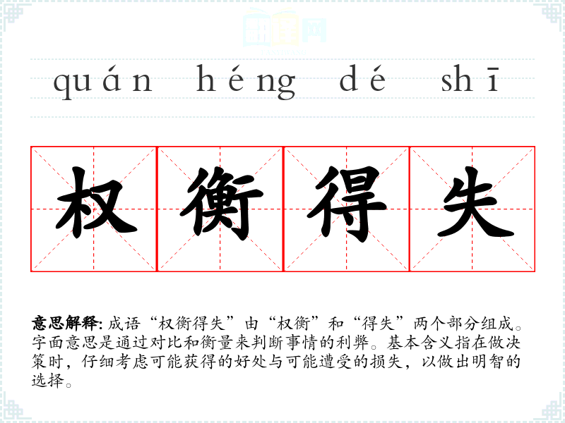 成语“权衡得失”由“权衡”和“得失”两个部分组成。字面意思是通过对比和衡量来判断事情的利弊。基本含义指在做决策时,仔细考虑可能获得的好处与可能遭受的损失,以做出明智的选择。