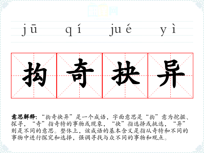 “抅奇抉异”是一个成语,字面意思是“抅”意为挖掘、探寻,“奇”指奇特的事物或现象,“抉”指选择或挑选,“异”则是不同的意思。整体上,该成语的基本含义是指从奇特和不同的事物中进行探究和选择,强调寻找与众不同的事物和观点。