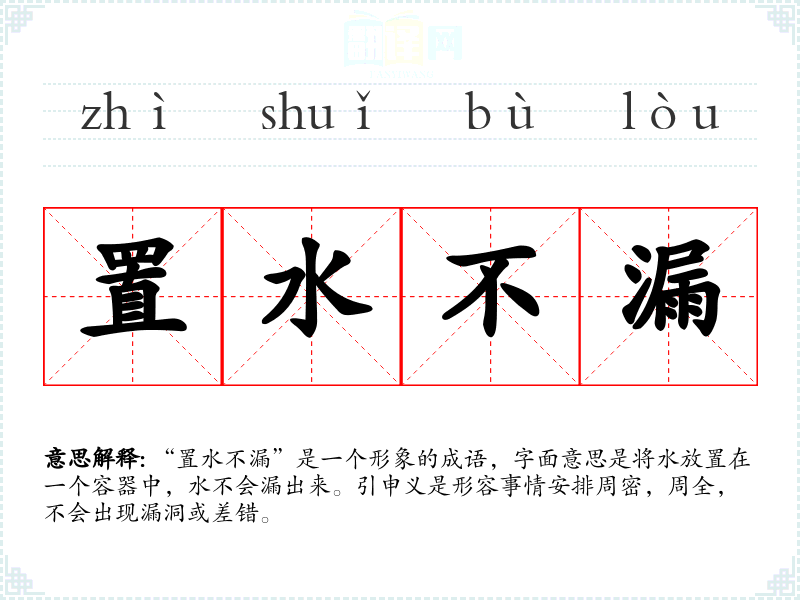 “置水不漏”是一个形象的成语,字面意思是将水放置在一个容器中,水不会漏出来。引申义是形容事情安排周密,周全,不会出现漏洞或差错。