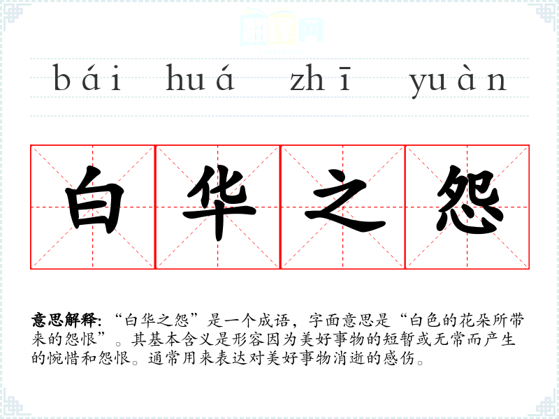 在古代,花朵常常象征着美好与短暂,特别是白色花朵,常被用来表现纯洁与美好。因此,“白华之怨”不仅反映了对美好事物的珍视,也反映了古人对生命无常的哲学思考。在现代社会,该成语依然适用于对美好瞬间的怀念,尤其是在快速发展的时代背景下,生活的瞬息万变使得这种情感尤为突出。