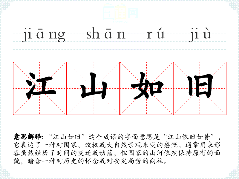 “江山如旧”这个成语的字面意思是“江山依旧如昔”,它表达了一种对国家、政权或大自然景观未变的感慨。通常用来形容虽然经历了时间的变迁或动荡,但国家的山河依然保持原有的面貌,暗含一种对历史的怀念或对安定局势的向往。