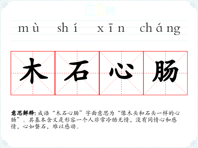 成语“木石心肠”字面意思为“像木头和石头一样的心肠”。其基本含义是形容一个人非常冷酷无情,没有同情心和感情,心如磐石,难以感动。