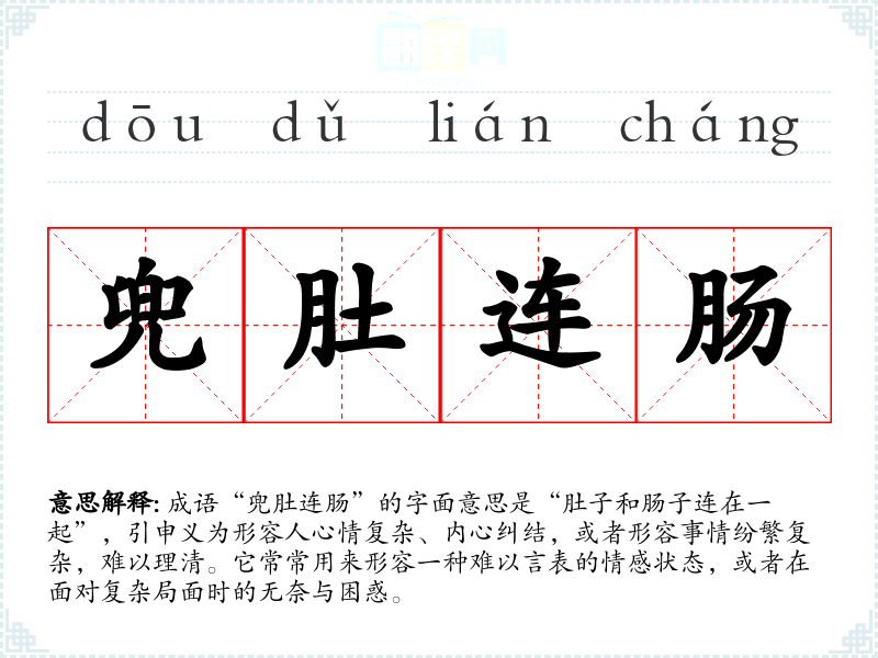 成语“兜肚连肠”的字面意思是“肚子和肠子连在一起”,引申义为形容人心情复杂、内心纠结,或者形容事情纷繁复杂,难以理清。它常常用来形容一种难以言表的情感状态,或者在面对复杂局面时的无奈与困惑。