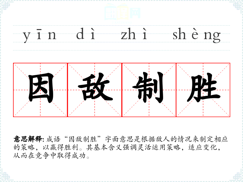 成语“因敌制胜”字面意思是根据敌人的情况来制定相应的策略,以赢得胜利。其基本含义强调灵活运用策略,适应变化,从而在竞争中取得成功。