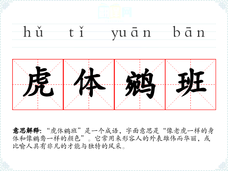“虎体鹓班”是一个成语,字面意思是“像**一样的身体和像鹓鸯一样的颜色”。它常用来形容人的外表雄伟而华丽,或比喻人具有非凡的才能与独特的风采。