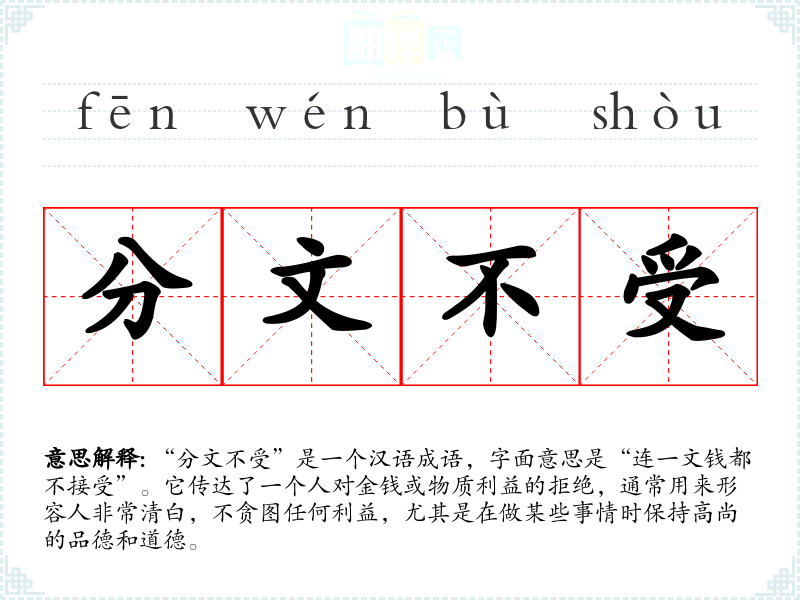 “分文不受”是一个汉语成语,字面意思是“连一文钱都不接受”。它传达了一个人对金钱或物质利益的拒绝,通常用来形容人非常清白,不贪图任何利益,尤其是在做某些事情时保持高尚的品德和道德。
