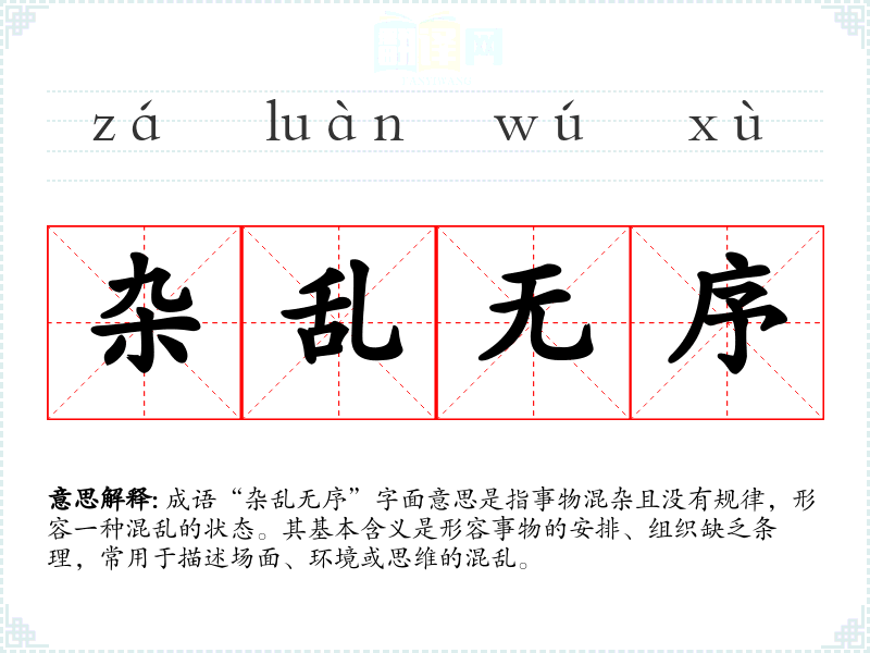成语“杂乱无序”字面意思是指事物混杂且没有规律,形容一种混乱的状态。其基本含义是形容事物的安排、组织缺乏条理,常用于描述场面、环境或思维的混乱。