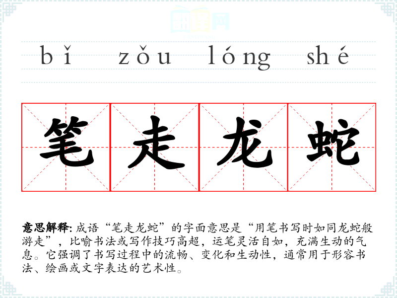 成语“笔走龙蛇”的字面意思是“用笔书写时如同龙蛇般游走”,比喻书法或写作技巧高超,运笔灵活自如,充满生动的气息。它强调了书写过程中的流畅、变化和生动性,通常用于形容书法、绘画或文字表达的艺术性。