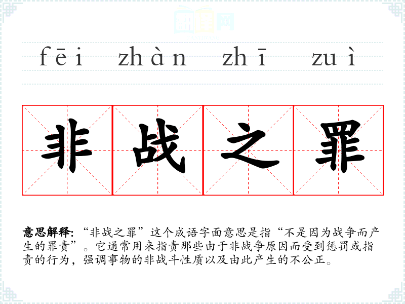 “非战之罪”这个成语字面意思是指“不是因为战争而产生的罪责”。它通常用来指责那些由于非战争原因而受到惩罚或指责的行为,强调事物的非战斗性质以及由此产生的不公正。