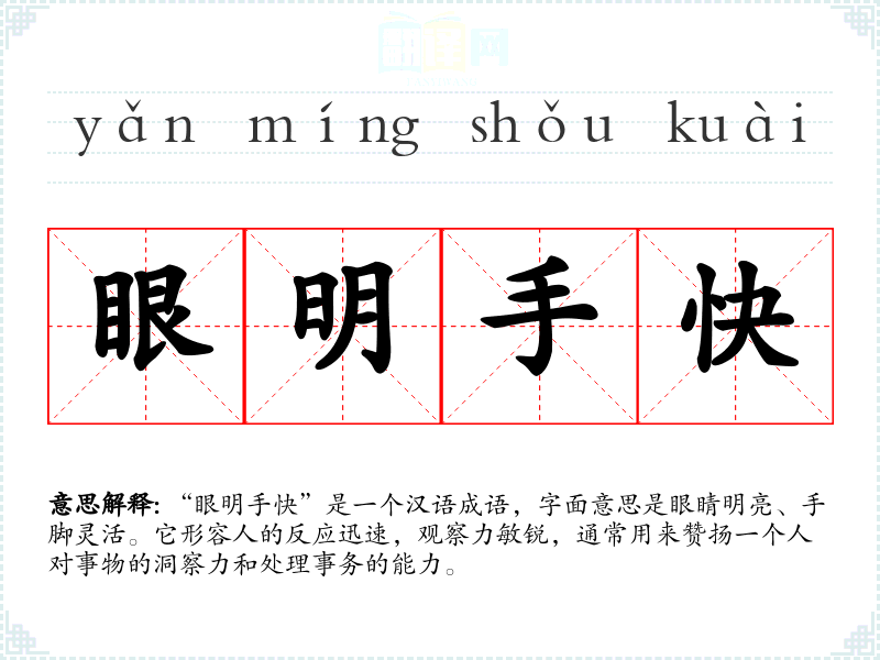 “眼明手快”是一个汉语成语,字面意思是眼睛明亮、手脚灵活。它形容人的反应迅速,观察力敏锐,通常用来赞扬一个人对事物的洞察力和处理事务的能力。